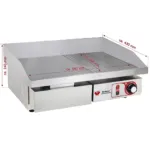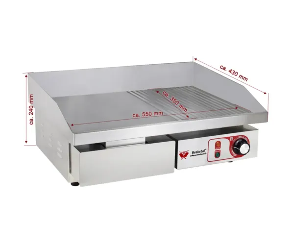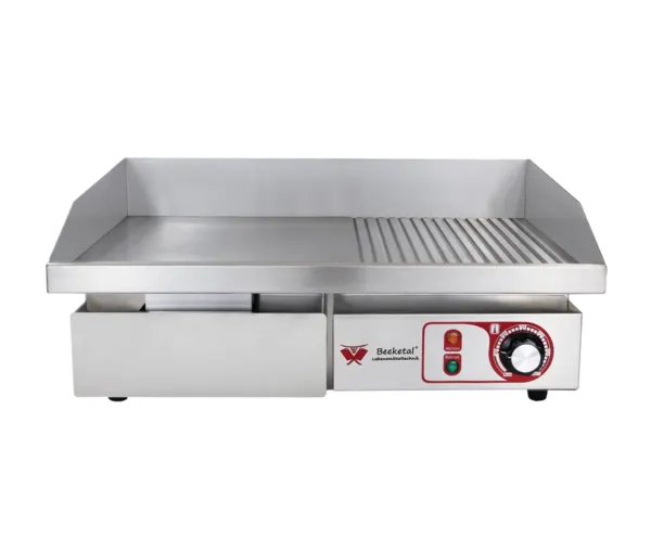 Gratarul electric profesional BGP-b combina suprafata neteda si canelata, permitand gatirea uniforma a ingredientelor si obtinerea texturilor perfecte pentru preparatele tale. Temperatura reglabila continuu intre 50-300°C ofera control total asupra procesului de gatire, iar sertarul detasabil pentru colectarea grasimii asigura curatare usoara si intretinere eficienta. Suprafata de gatire de 550×350 mm este ideala pentru gatirea mai multor portii simultan, imbunatatind productivitatea in bucatarie.