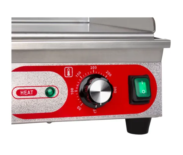 Gratarul electric fry-top dispune de o suprafata de gatire neteda din otel inoxidabil, care garanteaza o conductivitate termica optima si o distributie uniforma a caldurii. Aceasta caracteristica asigura preparate suculente si perfect gatite, indiferent daca este vorba despre carne, peste sau legume. Temperatura reglabila intre 50°C si 300°C ofera control complet asupra gatirii, iar puterea de 1,4 kW si alimentarea de 230V fac acest echipament eficient chiar si in spatii mai mici.