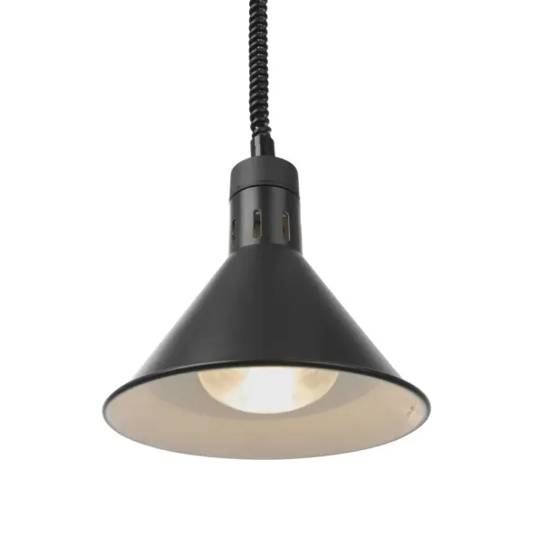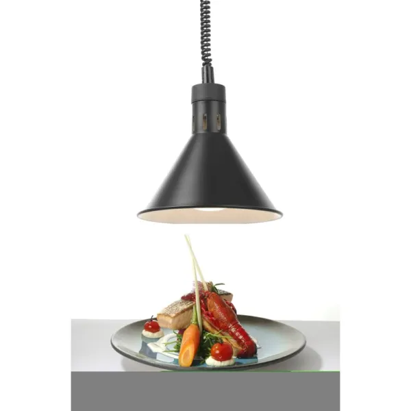 Datorita sistemului de incalzire cu infrarosu, aceasta lampa distribuie caldura uniform, pastrand alimentele la temperatura ideala fara a le usca sau afecta textura. Carcasa conica de culoare neagra ofera nu doar un aspect elegant, ci si o buna disipare a caldurii in spatiile intens utilizate.