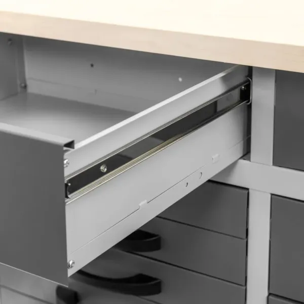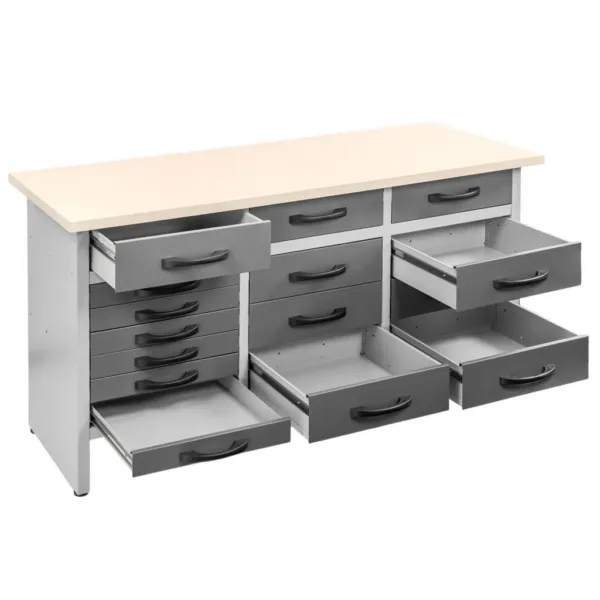 Acest banc de lucru este proiectat pentru a creste productivitatea prin organizarea eficienta a instrumentelor si materialelor. Cele 15 sertare de diferite dimensiuni ofera solutii flexibile de depozitare pentru scule, componente si accesorii, reducand timpul pierdut cautand echipamentele necesare. Blatul laminat de 3 cm este rezistent la uzura, zgariere si socuri mecanice, garantand o suprafata durabila pentru activitati intensive.