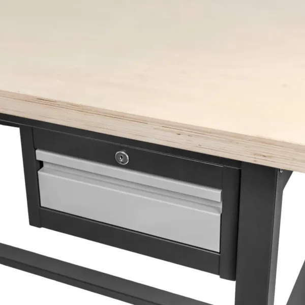 Acest banc de lucru oferă stabilitate și ergonomie, fiind construit pentru a rezista utilizării intensive. Sertarul cu închidere centrală permite organizarea eficientă a uneltelor și acces rapid, în timp ce suprafața de lucru robustă din placaj și MDF asigură durabilitate și rezistență la sarcini grele. Dimensiunile compacte îl fac ușor de integrat în spații mai mici, fără a compromite funcționalitatea.