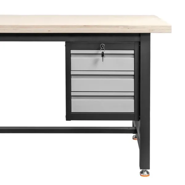 Construit din tablă vopsită și placaj, cu blat MDF de 30 mm, acest banc de lucru garantează stabilitate și rezistență la sarcini grele. Picioarele reglabile permit adaptarea rapidă la orice tip de podea, oferind siguranță și confort în utilizare. Designul modern, în nuanțe grafit cu fronturi gri, adaugă un aspect profesional spațiului de lucru.