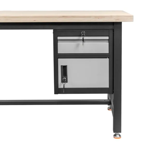 Structura metalica vopsita in camp electrostatic garanteaza stabilitate si protectie impotriva uzurii zilnice, in timp ce blatul din PAL si placaj de 30 mm grosime asigura rezistenta indelungata. Sertarul cu glisare completa ofera acces rapid, iar dulapul cu usa ofera un spatiu de depozitare suplimentar. Picioarele reglabile fac posibila montarea mesei chiar si pe pardoseli denivelate, mentinand echilibrul optim.