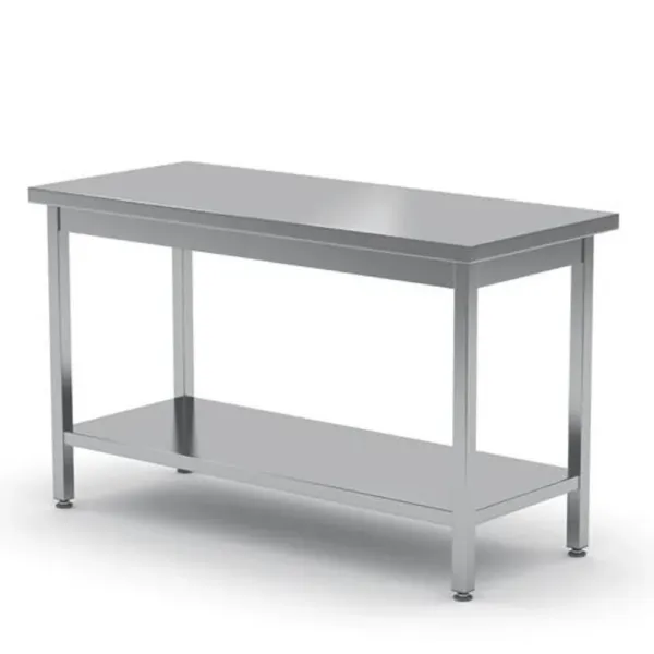 Această masa inox de lucru profesionala este prevăzută cu un blat ranforsat, gros de 0.8 mm, care asigură stabilitate și rezistență în timp, fiind ideală pentru sarcini zilnice intense. Raftul inferior susține organizarea eficientă a ingredientelor și ustensilelor, oferind acces facil în timpul fluxului de lucru. Colțurile rotunjite sporesc siguranța, iar finisajele netede contribuie la menținerea unui nivel înalt de igienă în bucătărie.
