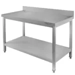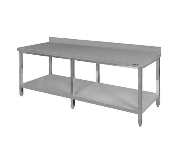 Datorita constructiei din otel inoxidabil de inalta calitate, masa asigura o rezistenta de lunga durata la uzura, coroziune si temperaturi ridicate. Blatul generos de 220×80 cm permite prepararea confortabila a produselor alimentare, in timp ce polita inferioara ofera spatiu suplimentar pentru depozitarea ustensilelor si echipamentelor. Cele sase picioare reglabile garanteaza stabilitate perfecta pe orice tip de suprafata, iar rantul integrat protejeaza peretele impotriva murdariei si stropilor.