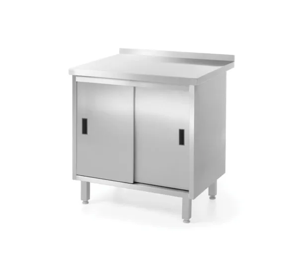 Mesele de inox tip dulap cu latimea de 600 mm cu rebord si usi glisante sunt disponibile intr-o gama variata de dimensiuni.