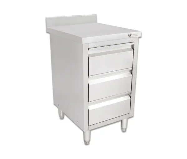 Masa de lucru tip dulap cu usi glisante realizata din inox prevazut cu sertare in partea dreapta.