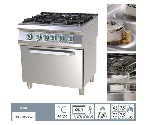 Mașina de gătit SPT780-21GE combină puterea și fiabilitatea unui aragaz profesional cu funcționalitatea unui cuptor electric de mare capacitate, fiind ideală pentru bucătăriile profesionale. Dotată cu 4 arzătoare pe gaz, unul de 4,5 kW și trei de 7,5 kW, aceasta asigură un gătit rapid și eficient. Cuptorul electric integrat, alimentat cu gaz și având o putere de 6,3 kW, este compatibil cu tăvi GN 2/1, fiind perfect pentru coacerea uniformă și consistentă a preparatelor.