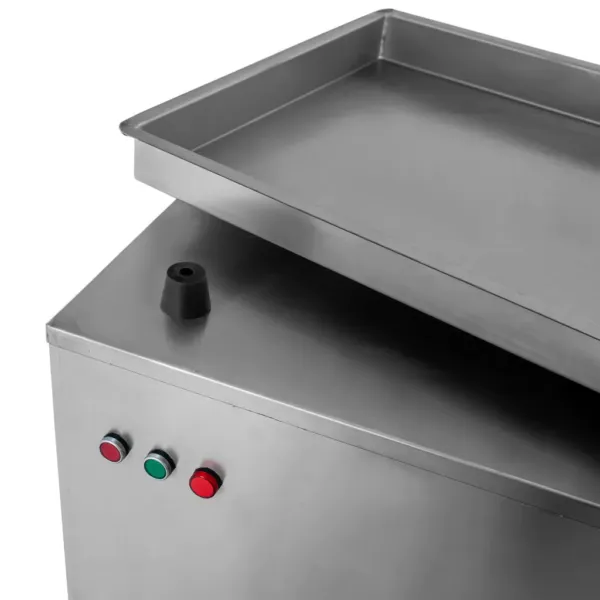 Carcasa robustă din inox alimentar garantează rezistență la uzură și coroziune, în timp ce dimensiunile sale generoase permit integrarea ușoară în linii de producție existente. Acest echipament este ideal pentru prepararea de produse precum cârnați, chiftele, burgeri sau amestecuri pentru mezeluri.
