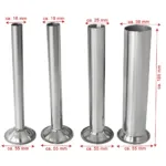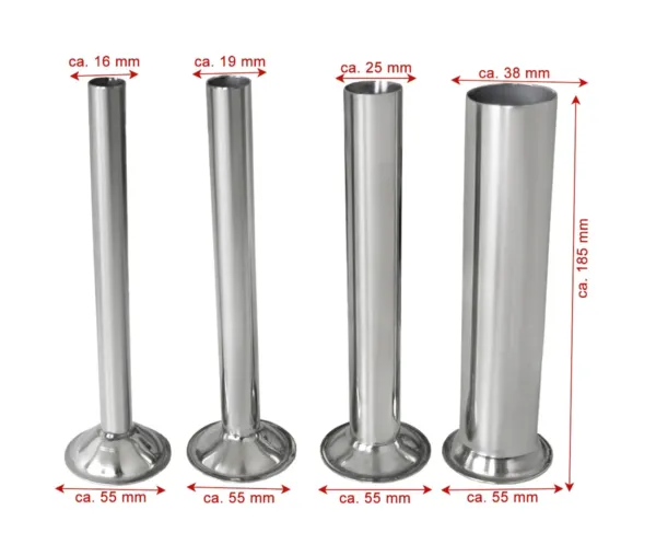 6. Set complet de pâlnii din inox – Aparatul vine la pachet cu 4 pâlnii din inox de dimensiuni diferite (16 mm, 19 mm, 25 mm și 38 mm), oferind posibilitatea de a prepara cârnați de diferite dimensiuni și forme. Schimbarea pâlniilor se face rapid și ușor prin intermediul unei piulițe mari, care poate fi strânsă manual.