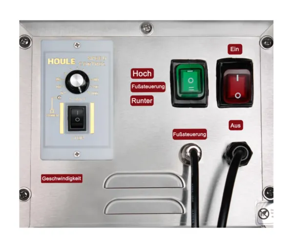 1. Variator de viteză pentru control precis – Aparatul este echipat cu un variator de viteză, oferind utilizatorului flexibilitate în ajustarea vitezei de umplere în funcție de necesitățile specifice fiecărui tip de amestec de carne. Această caracteristică permite obținerea unui flux de lucru optimizat și o umplere precisă a cârnaților.
