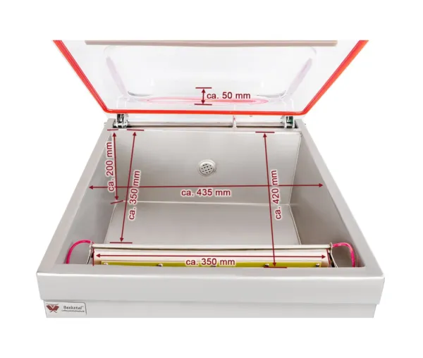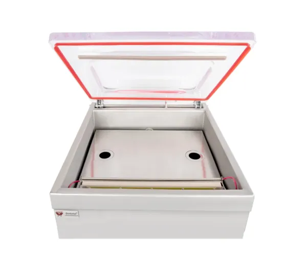 - Camera de vidare, cu dimensiunil de 438x420x200 mm, vă permite să sigilați cantități mari de produse într-o singură sesiune, economisind timp și resurse.