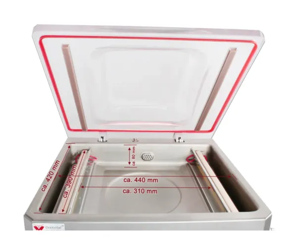 Mașina de vidat cu cameră 400 mm este un aparat de vidat profesional, special conceput pentru unități HoReCa, precum restaurante, cafenele, pizzerii, laboratoare de patiserie și măcelării. Cu un design compact și robust, realizat din oțel inoxidabil de înaltă calitate, această mașină de ambalat în vid asigură durabilitate, rezistență la coroziune și performanțe constante pe termen lung.