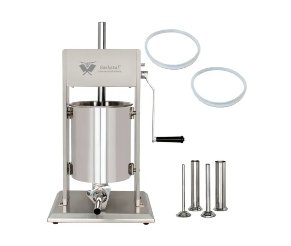 Mașina de umplut cârnați inox 10 litri este ideală pentru uz profesional sau casnic, respectând cele mai stricte standarde CE. Proiectată cu o structură robustă din oțel inoxidabil de înaltă calitate, acest aparat oferă durabilitate și protecție împotriva coroziunii, fiind extrem de ușor de curățat.