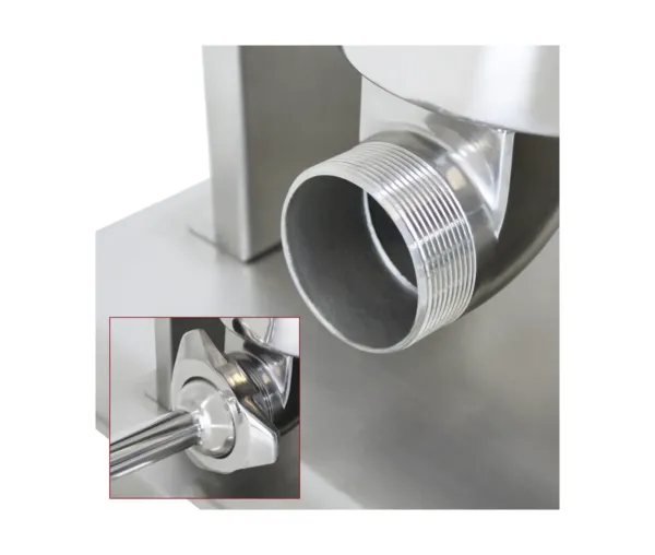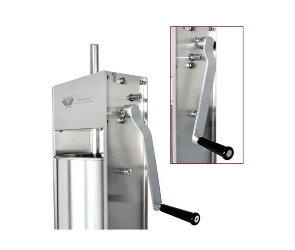 Funcționalitate: Această mașină de umplut cârnați verticală se remarcă prin două viteze de funcționare: o viteză lentă pentru coborârea pistonului și una rapidă pentru ridicarea acestuia. Cu un cilindru reversibil, utilizatorii pot manevra cu ușurință atât din partea dreaptă, cât și din stânga. Manivela ergonomică asigură o transmisie eficientă a puterii, facilitând procesul de umplere.
