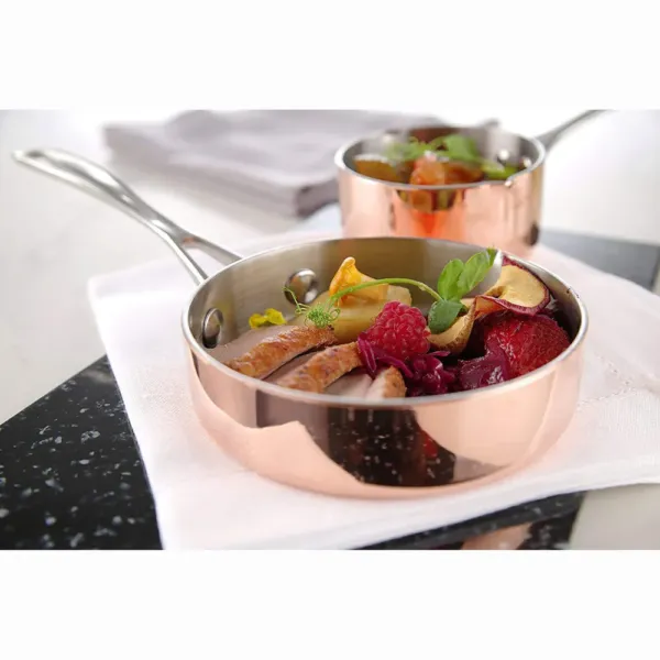 Fabricata dintr-un material compozit format din trei straturi – cupru, aluminiu si otel inoxidabil – mini-tigaia asigura o distributie uniforma a caldurii, evitand punctele fierbinti si asigurand gatirea omogena a alimentelor. Structura rezistenta, fixata cu nituri, confera durabilitate si stabilitate, fiind ideala pentru uz intens in mediul horeca. Dimensiunile compacte permit manevrarea usoara si un control excelent al procesului de prajire, adaptandu-se nevoilor specifice ale bucatarilor profesionisti.