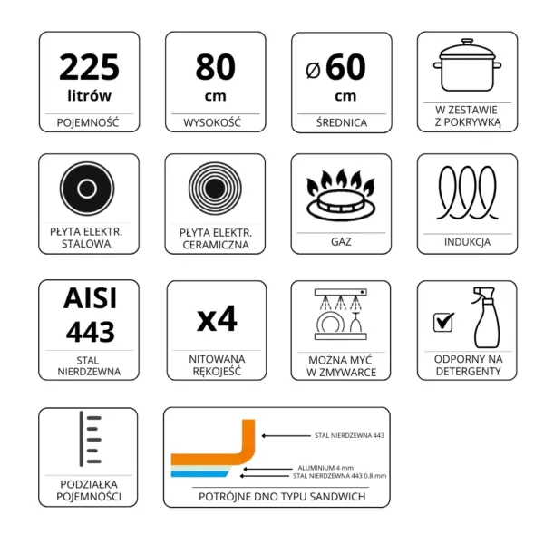 Datorită inserției ferromagnetice integrate în bază, oala inox profesională 225L este compatibilă cu toate tipurile de plite – gaz, electrică, vitroceramică și inducție. Această versatilitate o transformă într-un instrument indispensabil pentru orice bucătărie profesională, asigurând performanță constantă indiferent de sursa de căldură utilizată.