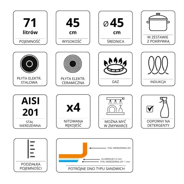 Oala inox, inalta, cu capac 71L (45×45 cm) reprezinta solutia ideala pentru prepararea in volum mare a mancarurilor in bucatariile profesionale. Datorita capacitatii sale generoase, aceasta oala este perfecta pentru prepararea supelor, ciorbelor, bulioanelor, sosurilor si mancarurilor gatite pentru un numar mare de persoane. Constructia robusta din otel inoxidabil asigura rezistenta la coroziune si mentinerea calitatii produsului chiar si dupa ani de utilizare zilnica.