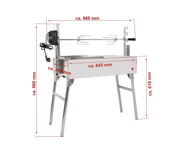 Un alt beneficiu important al acestui protap rotisor electric este posibilitatea de a regla înălțimea rotisoritului în 3 trepte, ceea ce permite ajustarea distanței între foc și pui în funcție de preferințele de gătire sau de tipul de preparat. Acest lucru garantează o gătire perfectă pentru fiecare pui, ajustând temperatura în mod optim. De asemenea, cu dimensiuni de 865 x 360 x 880 mm și o greutate de 11,5 kg, protapul este compact și ușor de manevrat, potrivit pentru orice spațiu de lucru.