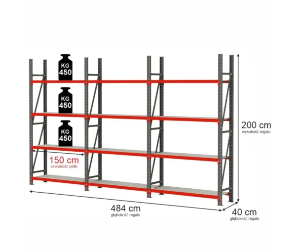 Raft metalic 12 polite, inaltime 200 cm, lungime 484 cm, adancime 40 cm, capacitate 450 kg