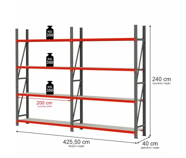 Raft metalic 8 polite, inaltime 240 cm, lungime 425,5 cm, adancime 40 cm, capacitate 350 kg