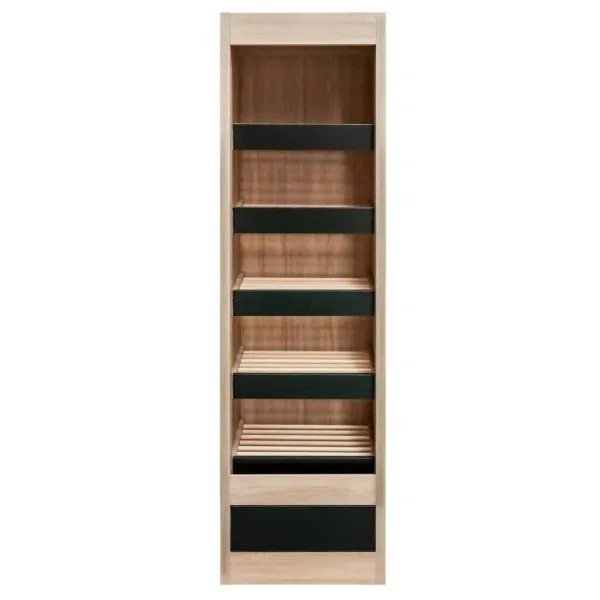 Acest raft oferă un acces facil la produsele expuse, optimizând experiența clientului și creând un impact vizual atractiv. Forma sa verticală și compactă permite economisirea spațiului, în timp ce designul modern se integrează armonios în orice amenajare comercială. Raftul de paine deschis este proiectat să mențină prospețimea produselor, datorită ventilării naturale prin polițele cu lamele din lemn, oferind în același timp un aspect elegant și profesionist.