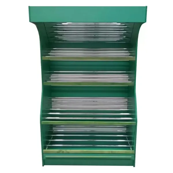 Fabricat din materiale rezistente, acest raft metalic pentru legume este adaptat mediilor comerciale cu trafic intens. Designul sau permite pastrarea curateniei atat pe suprafata rafturilor, cat si dedesubt, asigurand standarde ridicate de igiena. Culoarea verde transmite ideea de prospetime si naturalete, armonizandu-se perfect cu nuantele fructelor si legumelor expuse.