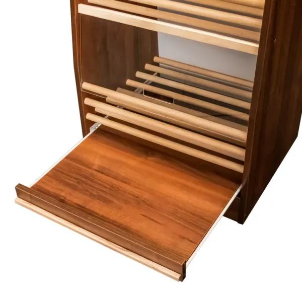 Fabricat din lemn de inalta calitate, acest raft pentru paine este robust si rezistent la uz intens. Dimensiunea compacta permite integrarea in spatii mai mici, iar tava pentru firimituri ajuta la mentinerea curateniei. Finisajul in nuante de nuc eco confera un aspect modern si natural, potrivit oricarui ambient comercial, oferind un plus de atractivitate pentru clienti.