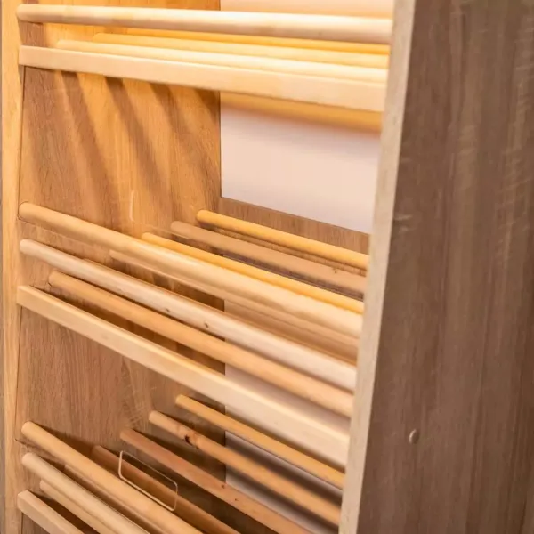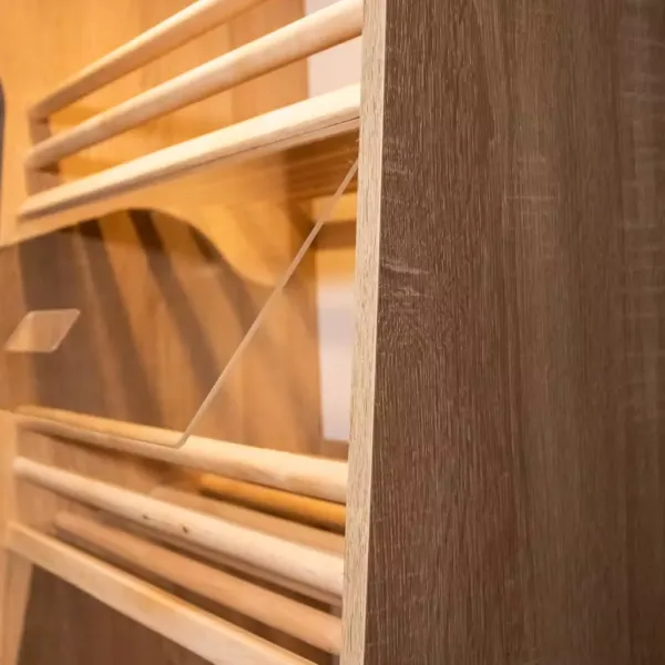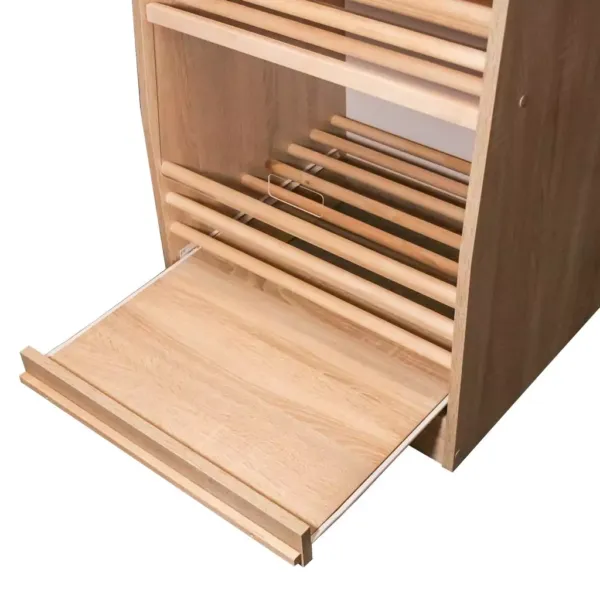 Fabricat din lemn de calitate, acest raft pentru paine este robust si rezistent la utilizarea zilnica. Designul compact cu latimea de 60 cm il face potrivit chiar si pentru spatii mai inguste, iar tava pentru firimituri ajuta la mentinerea curateniei. Finisajul stejar sonoma confera un aspect elegant, integrandu-se perfect in decorul profesional al magazinului sau al patiseriei.