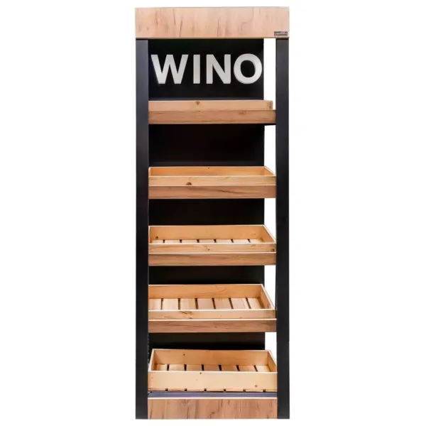 Acest raft pentru vin ofera o solutie practica si estetica pentru expunerea sticlelor. Politele din lemn, combinate cu suportul metalic solid, permit ajustarea inaltimei si a unghiului pentru o expunere personalizata a vinurilor. Iluminarea LED si oglinda incorporata evidentiaza fiecare sticla, sporind atractivitatea produselor si imbunatatind experienta clientilor.