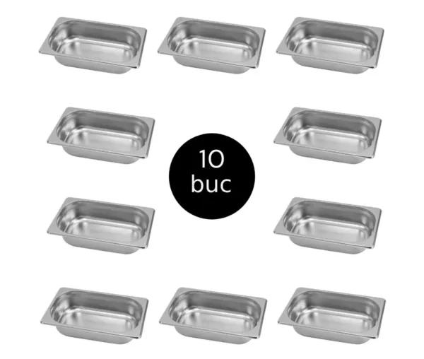 Setul de 10 recipiente GN 1/4 cu dimensiunile 26,5×16,2×6,5 cm este fabricat din otel inoxidabil de inalta calitate, rezistent la zgarieturi, coroziune si utilizare intensa. Materialul neutru biologic garanteaza siguranta completa in contact cu alimentele, iar suprafata neteda si colturile rotunjite faciliteaza curatarea rapida, asigurand standarde inalte de igiena pentru bucatarii profesionale si fluxul de lucru din restaurante si cafenele