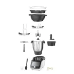 Robotul este livrat cu un set complet de accesorii care sprijina o varietate mare de operatiuni. De la discuri multifunctionale si lame din otel intarit la teluri specializate si spatule termorezistente, toate componentele sunt proiectate pentru durabilitate si eficienta. Setul pentru gatit la abur, cu componente modulare, permite prepararea delicata a ingredientelor, mentinand valorile nutritionale si gustul autentic.