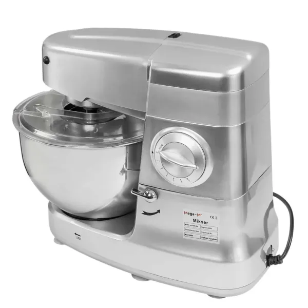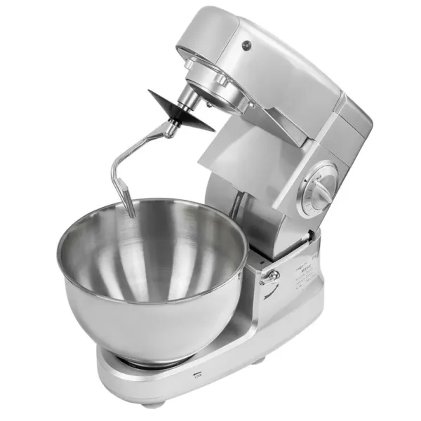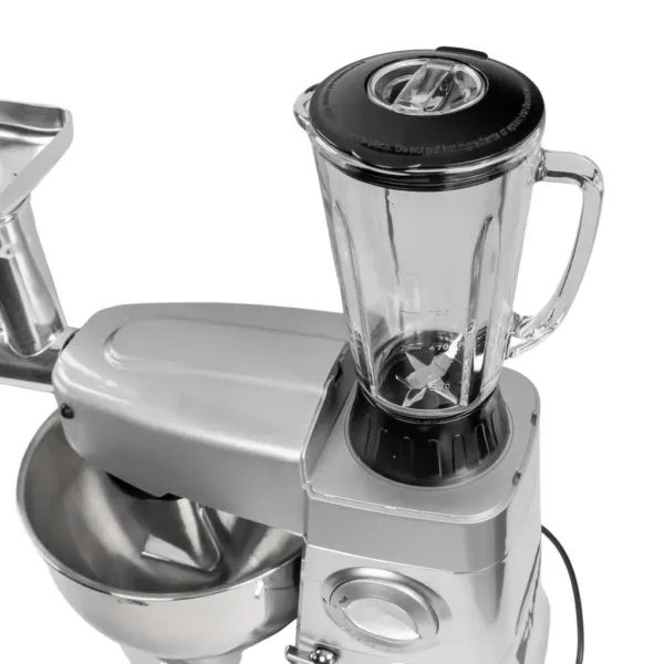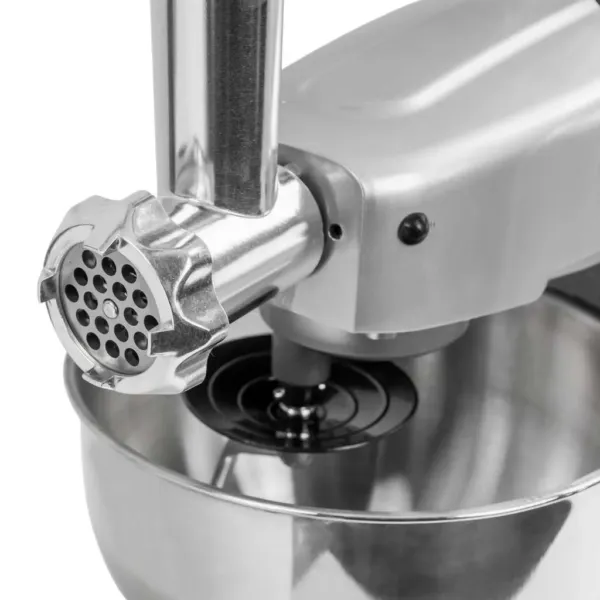 Robotul multifunctional combina functiile de mixer planetar, masina de tocat carne si blender, oferind un echipament 3-in-1 care economiseste spatiu si timp. Stabilitatea si siguranta sunt asigurate de picioarele antiderapante si protectiile incorporate, iar accesoriile incluse – carlig pentru aluat, mixer plat si tel – permit adaptarea rapida la diferite preparate. Dispozitivul functioneaza silentios si ergonomic, ideal pentru medii cu productie intensa.