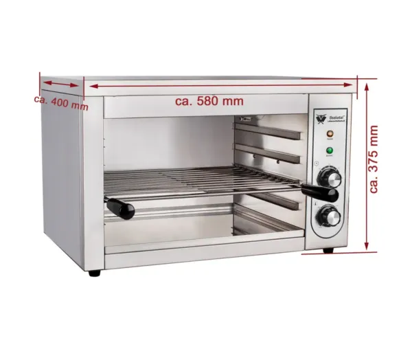 Salamandra profesională 435x360x260 mm este un echipament indispensabil pentru unitățile HoReCa care doresc să ofere preparate de înaltă calitate. Cu un design compact, performanță ridicată și caracteristici versatile, această salamandră este perfectă pentru gătire, gratinare sau încălzire, adaptându-se nevoilor bucătăriilor profesionale din restaurante, cafenele, fast-food-uri și catering.