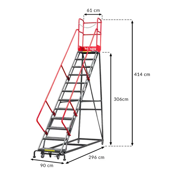 Cu o inaltime de lucru de 414 cm si o platforma situata la 306 cm, aceasta scara profesionala cu platforma permite manipularea usoara a marfurilor pe rafturi inalte, fiind ideala pentru spatii de depozitare, zone de productie si intretinere tehnica. Designul ergonomic si dimensiunile treptelor asigura o urcare usoara, reducand oboseala in timpul utilizarii indelungate.