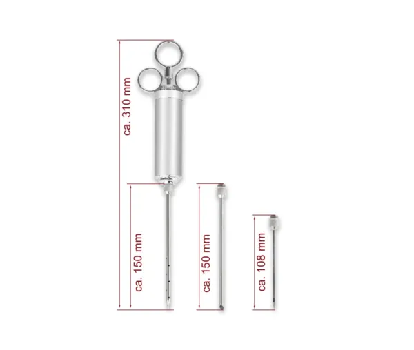 Capacitatea de 100 ml ofera un echilibru optim intre volum si precizie, permitand dozarea corecta a lichidelor fara risipa. Acele lungi de 155 mm asigura patrunderea profunda in carne, ceea ce imbunatateste semnificativ procesul de marinare si reduce timpul de pregatire in bucatariile profesionale.