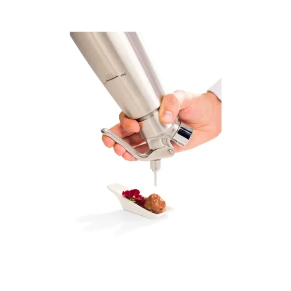Fabricat din otel inoxidabil de inalta calitate, sifonul de frisca profesional este construit pentru a rezista utilizarii intense, oferind rezultate constante si sigure. Este ideal pentru prepararea frișcăi proaspete, spumelor reci si sosurilor aerate, permitand decorarea cu textura fina si control deplin.