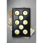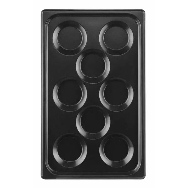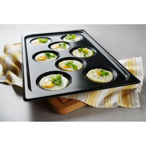 Aceasta tava GN 1/1 pentru cuptor profesional permite pregatirea simultana a opt portii individuale, asigurand un rezultat uniform datorita formei standardizate si distributiei excelente a caldurii. Este perfecta pentru restaurante care servesc mic dejunuri, cafenele sau unitati de catering cu volum ridicat de comenzi. Designul sau asigura consistenta si rapiditate, reducand timpii de productie si facilitand o servire impecabila.