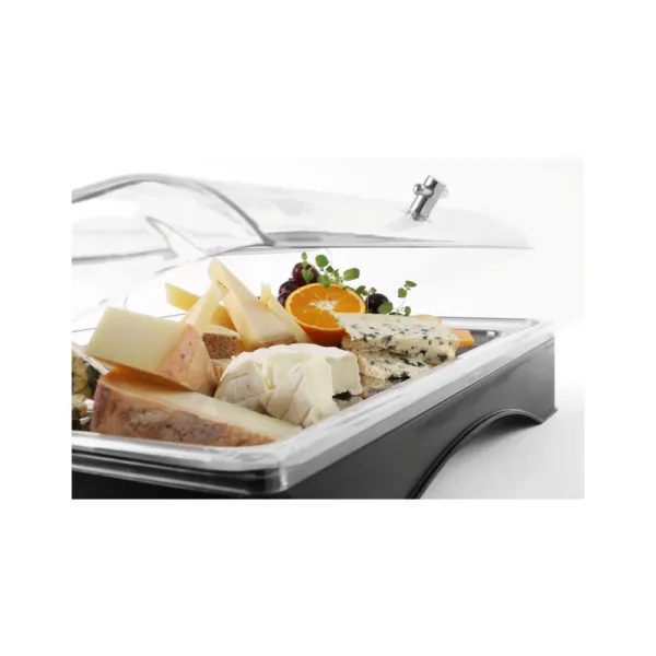 Datorită dimensiunilor 555x357x(H)175 mm, această tavă GN 1/1 poate fi utilizată în mod eficient în spațiile de servire sau în unități comerciale unde se impune o expunere vizibilă a produselor. Carcasa din ABS adaugă un plus de durabilitate și rezistență, iar capacul transparent permite o vizibilitate clară a alimentelor, contribuind la o prezentare deosebită a acestora.