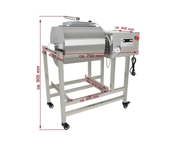 - Procesare rapidă și eficientă: Acest tumbler vacuum carne permite prelucrarea rapidă a cărnii, reducând timpul de marinare și frăgezire. Cu o capacitate de până la 20 kg de carne per ciclu, este perfect pentru volume mari de producție.