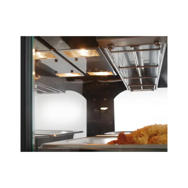 Datorita sistemului compus din doua elemente de incalzire cu quartz si a placii termice inferioare, temperatura este distribuita uniform pe ambele nivele ale vitrinei. Controlul mecanic permite ajustarea temperaturii intre 30 si 90 °C, in functie de tipul produselor – fie ca este vorba despre pizza, produse de patiserie sau gustari tip fast-food, acestea raman calde si apetisante.