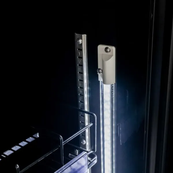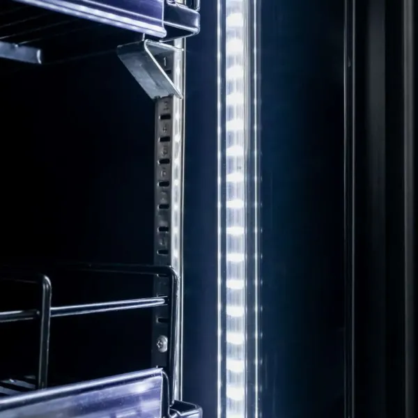 Designul elegant Full Glass și carcasa neagră cu finisaje din oțel inoxidabil conferă un aspect sofisticat vitrinei, sporind atractivitatea produselor expuse. Iluminarea LED verticală pe partea dreaptă evidențiază fiecare detaliu, iar ușa auto-închisă menține temperatura optimă fără efort suplimentar din partea personalului. Sistemul de răcire dinamic și agentul frigorific R290 asigură o temperatură constantă între 0 și +10°C, menținând prospețimea băuturilor, lactatelor sau produselor gata de consum.
