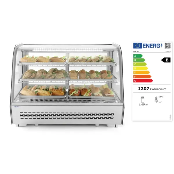 Echipata cu iluminare LED in partea superioara, vitrina asigura vizibilitate excelenta asupra continutului, atragand atentia clientilor si evidentiind calitatea produselor expuse. Sistemul de racire ventilat, impreuna cu controlul digital al temperaturii, garanteaza o distributie uniforma a aerului rece, mentinand o temperatura constanta in intervalul 2–6°C, ideala pentru produse sensibile la variatii termice.